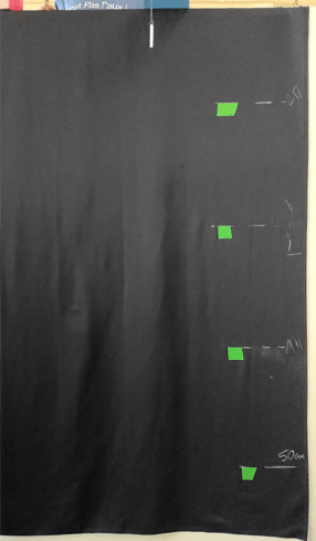 On notera bien que les tirets noirs font la séparation entre la zone depuis laquelle on peut lancer des craies et espérer les retrouver intactes et celle où elles se cassent systématiquement. Ils délimitent ainsi une hauteur maximale de non-rupture.