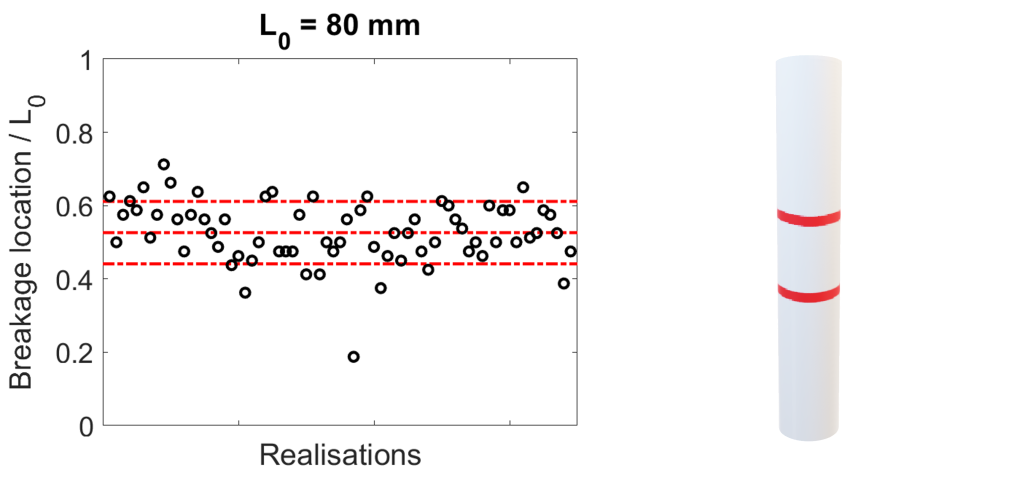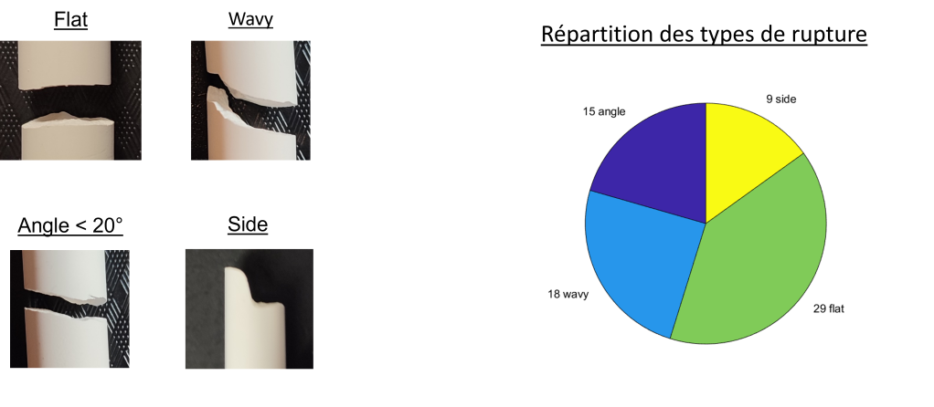 On remarque que la craie se rompt majoritairement entre 40% et 60% de sa longueur et que la rupture est nette et plate la plupart du temps.