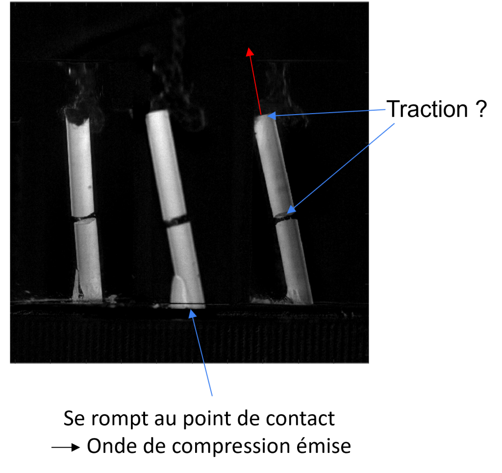Un train d’onde est émis au point de contact au sol, remonte la craie, se reflète en haut puis rencontre un autre train d’onde ce qui cause la rupture.