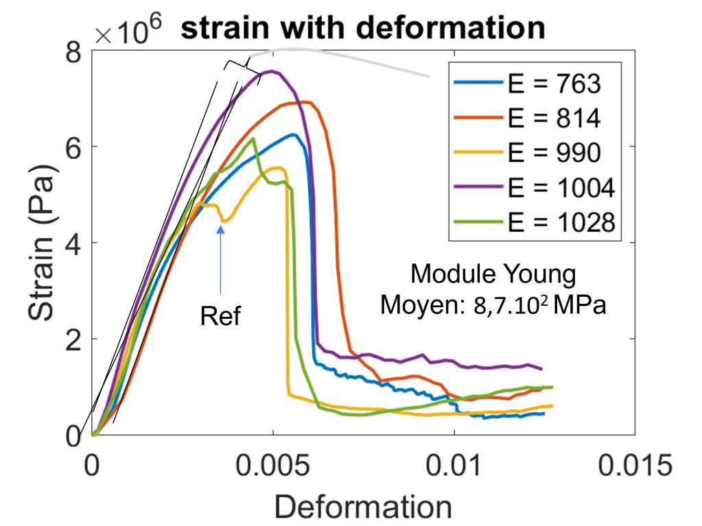 Le module d’Young ne renseigne pas quant à ce qu’il va se passer pour la craie : en effet, la courbe « Ref » a un module d’Young moyen par rapport aux autres et se rompt nettement plus tôt quand même.