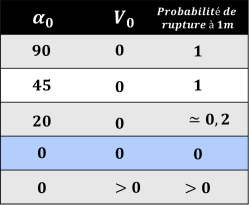 Nous avons effectué un grand nombre de lancers depuis une hauteur de 1m en faisant varier l’angle de chute et nous observons que pour des vitesses initiales nulles, la manière optimale de lâcher la craie est à la verticale. Dès que l’on donne de la vitesse à la craie, la probabilité de rupture à 1m devient non-nulle.