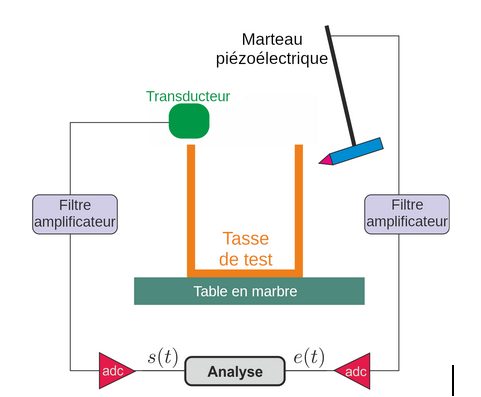 Le montage expérimental est composé de plusieurs éléments. La tasse que l’on considère qui était dans notre cas un bécher sans anse par mesure de simplicité mais aussi pour pouvoir jouer sur les paramètre physique de l’objet sans changer le matériaux), la table en marbre sur laquelle était fixé le bécher, un marteau d’impact, un micro ultra directionnel, un ordinateur ainsi que les appareils pour convertir et acheminer les signaux à l'ordinateur. Le montage est le suivant :