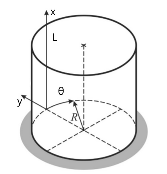 On commence par modéliser une tasse sans anse (bécher) par une coque cylindrique homogène à paroi mince de rayon R, de longueur L, d'épaisseur h, dont la surface centrale est rapportée au repère de coordonnées curvilignes (x,θ).