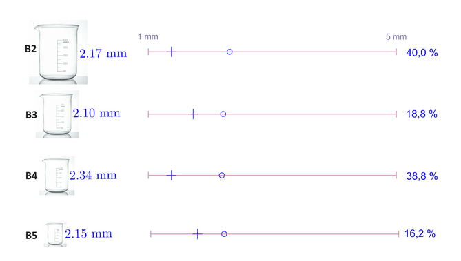 Sur cette figure, on considère 4 béchers de taille différente et on varie l’épaisseur h de 1 à 5 mm, après on génère à l’aide de Freefem++ pour chaque h le spectre de fréquences propres associés et on essaye de le matcher avec les fréquences expérimentales comme à la méthode précédente. Ensuite, on calcule l’écart pour chaque configuration (en pourcentage) entre l’épaisseur exacte et l’épaisseur généré par Freefem++. Le résultat semble satisfaisant pour le bécher le plus petit et donc cette méthode pourrait être une alternative de la première dans le cas où la tasse est assez petite ce qui viole les hypothèses du modèle de la coque cylindrique mince.