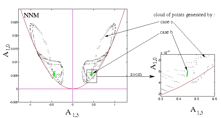 Section de Poincaré dans l'espace des phases, montrant la meilleure approximation --en terme de sous-espace-- donnée par le mode non-linéaire (MNL, ligne courbe proche des points de la simulation complète), comparée au sous-espace (linéaires) donnés par la méthode POD.
