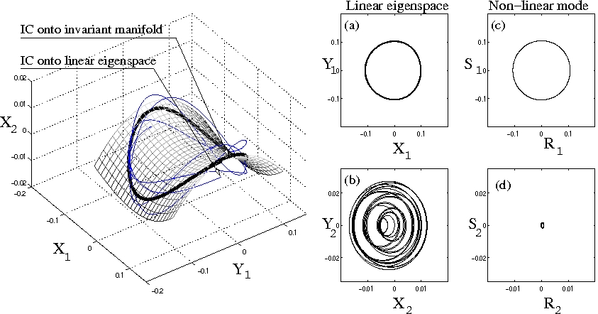 Les modes normaux non-linéaires sont définis dans le cadre de la théorie des systèmes dynamiques comme des variétés invariantes de l'espace des phases, tangents à l'origine aux sous-espaces propres (modes linéaires) considérés. Cette définition donne un cadre adéquat pour la réduction de modèles : en projetant la dynamique sur ces sous-espaces invariants on obtient des modèles réduits prédisant les éléments essentiels (bifurcations) de la dynamique. Ci-dessous, le mode non-linéaire (variété invariante) pour un problème à deux degrés de liberté.