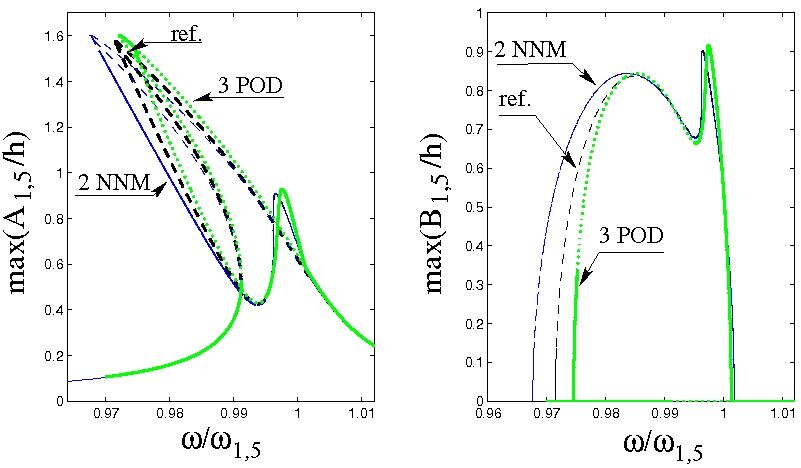 Ci-dessous : comparaison de la réponse en fréquence pour une coque cylindrique forcée harmoniquement au voisinage d'une résonance d'un mode compagnon, comparaison entre un solution de référence (noire), le modèle réduit obtenu avec 2 modes non-linéaires (bleu) et celui obtenu avec 3 modes POD (vert).