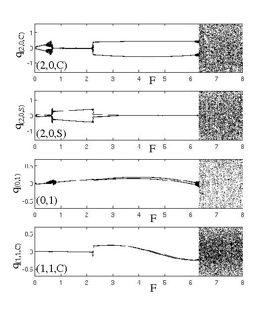 La transition des solutions périodiques aux états chaotiques est étudiée pour les plaques circulaires minces, parfaites et imparfaites, à bord libre, dans le cadre des modèles utilisant les développements modaux utilisés pour étudier les premières bifurcations. Le but est de reproduire le schéma de transition vers le chaos observé génériquement pour les coques minces, cf. la page sur les gongs et les cymbales. Les EDPs sont donc projetées sur une base suffisamment riche de modes propres (de 20 à 30 modes sont utilisés dans les simulations), et les EDOs resultantes sont intégrées en temps en utilisant un schéma BDF pour les problèmes raides. Les résultats sont représentées en utilisant des sections de Poincaré (stroboscopie à la période du forçage externe). Ci-dessous, le cas d'une plaque imparfaite, montrant l'apparition d'un doublement de période avant l'instauration du régime chaotique.