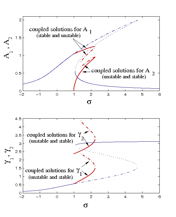 La résonance 1:1, qui intervient pour les plaques circulaires pour tous les modes asymétriques, a été étudié théoriquement et expérimentalement. Ci-dessous, la courbe de résonance montrant le couplage entre les deux configurations.