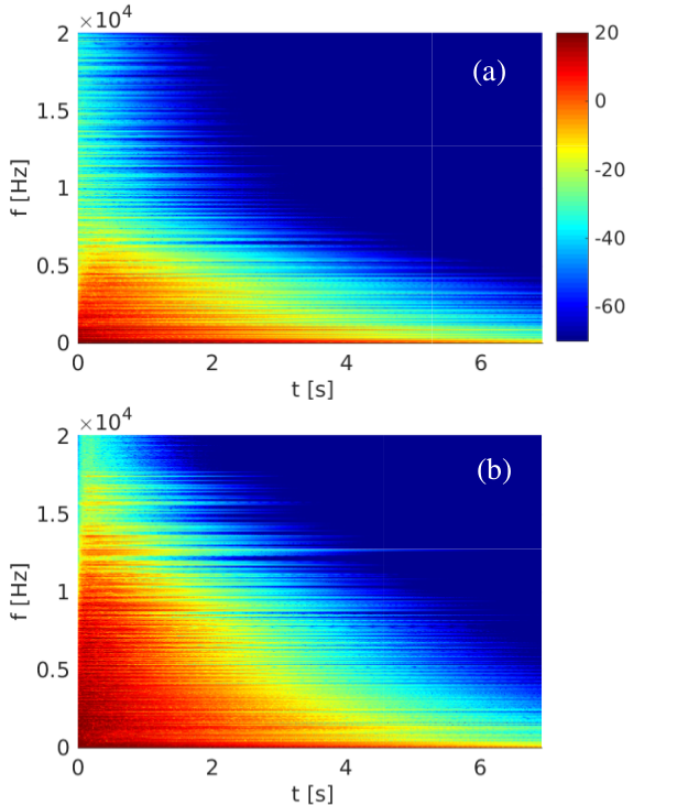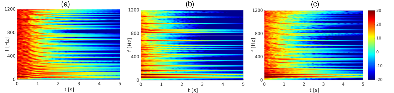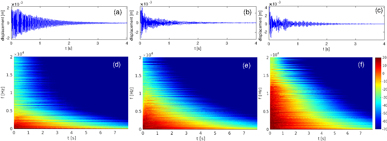 The figure below reproduces Fig. 9 of the paper and showing the spectrograms corresponding to the sounds of cases (a) to (f) explained above